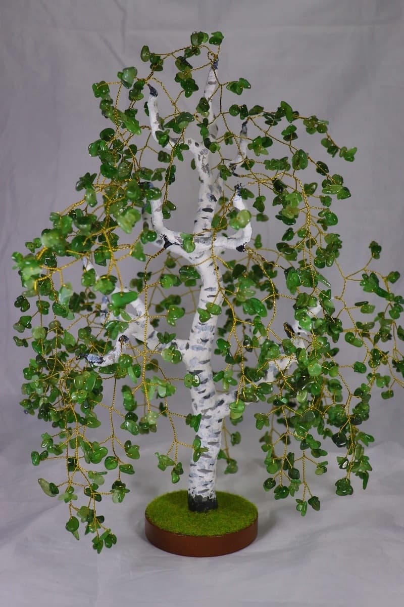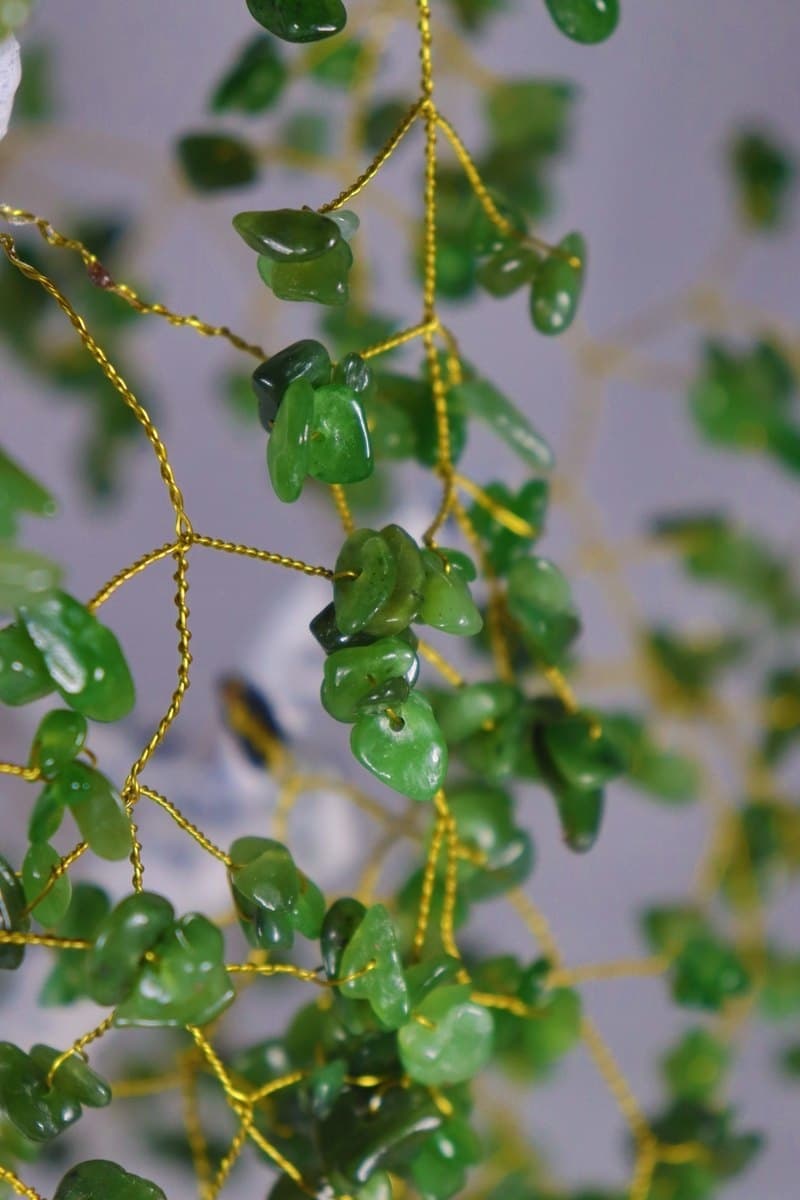 Крохотные листья-самоцветы крепятся к латунной проволоке и образуют крону деревца счастья. А готовые веточки крепятся к стволу, после завершения сборки мастер изгибает ствол и ветви деревца таким образом, чтоб добиться максимальной естественности линий. Дерево счастья готово — рассматривайте фотографии и сравнивайте его с соседями по каталогу.