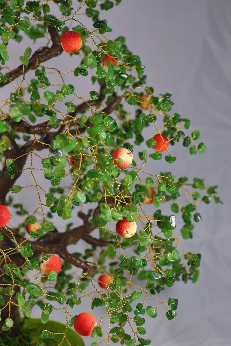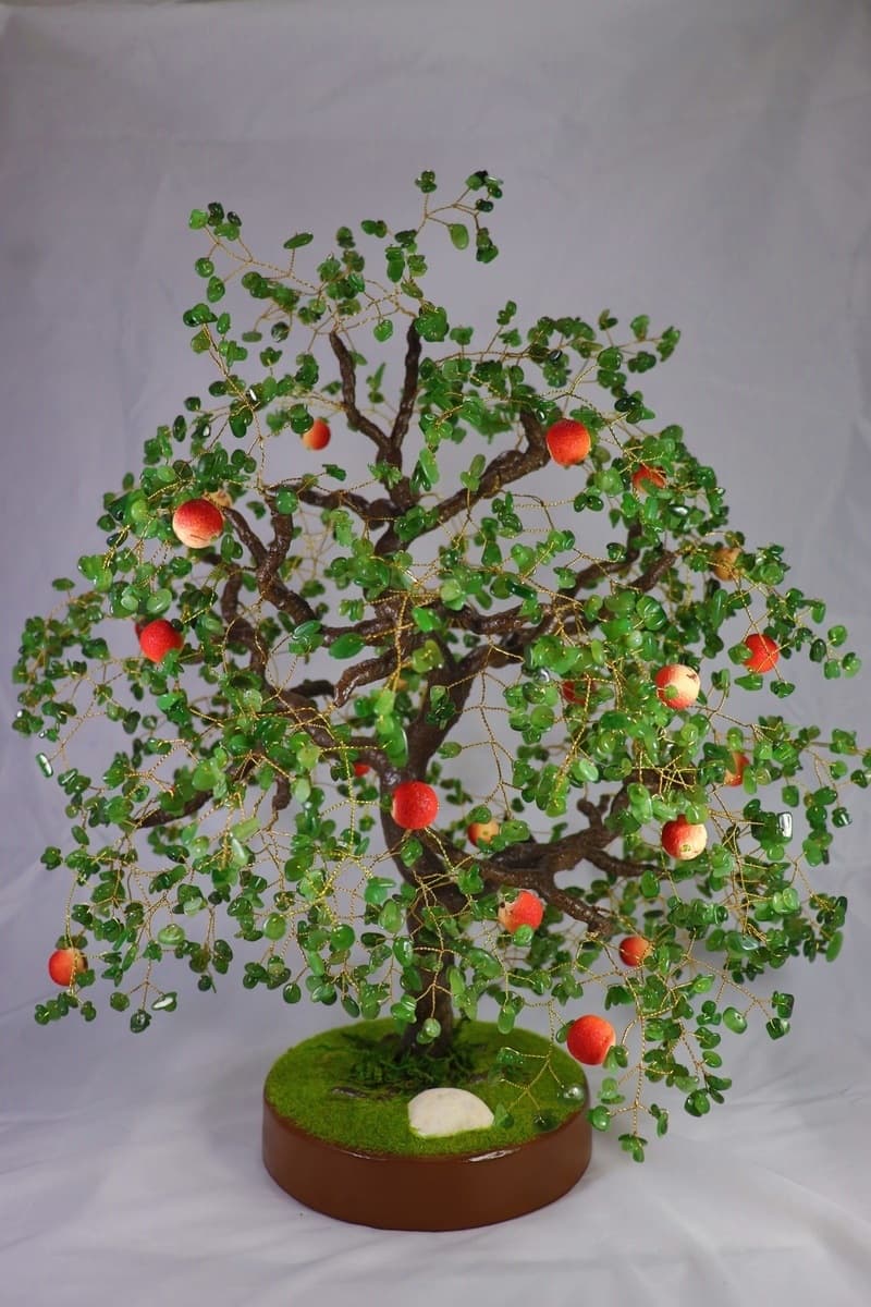 Крохотные листья-самоцветы крепятся к латунной проволоке и образуют крону деревца счастья. А готовые веточки крепятся к стволу, после завершения сборки мастер изгибает ствол и ветви деревца таким образом, чтоб добиться максимальной естественности линий. Дерево счастья готово — рассматривайте фотографии и сравнивайте его с соседями по каталогу.