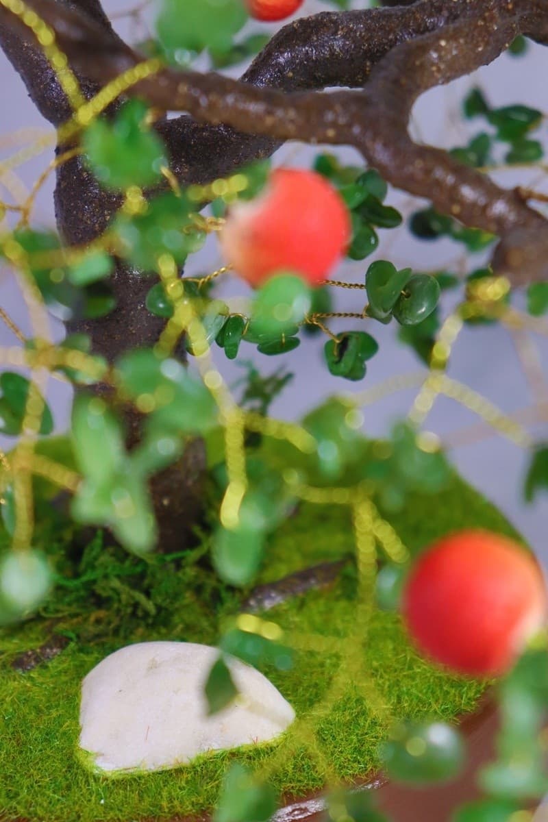 Работа по изготовлению дерева счастья очень кропотлива. Сначала мастер просверливает отверстия в камушках, затем каждый камушек по отдельности нанизывает на проволоку и плетет ветви будущего деревца. На каждой веточке размещается с десяток крохотных камней на проволочных ножках — каменные листья на стебле.