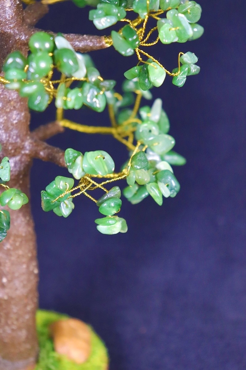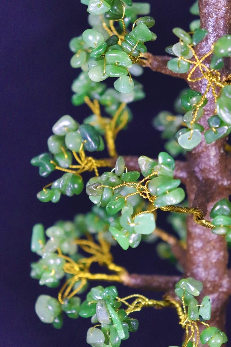 Крохотные листья-самоцветы крепятся к латунной проволоке и образуют крону деревца счастья. А готовые веточки крепятся к стволу, после завершения сборки мастер изгибает ствол и ветви деревца таким образом, чтоб добиться максимальной естественности линий. Дерево счастья готово — рассматривайте фотографии и сравнивайте его с соседями по каталогу.