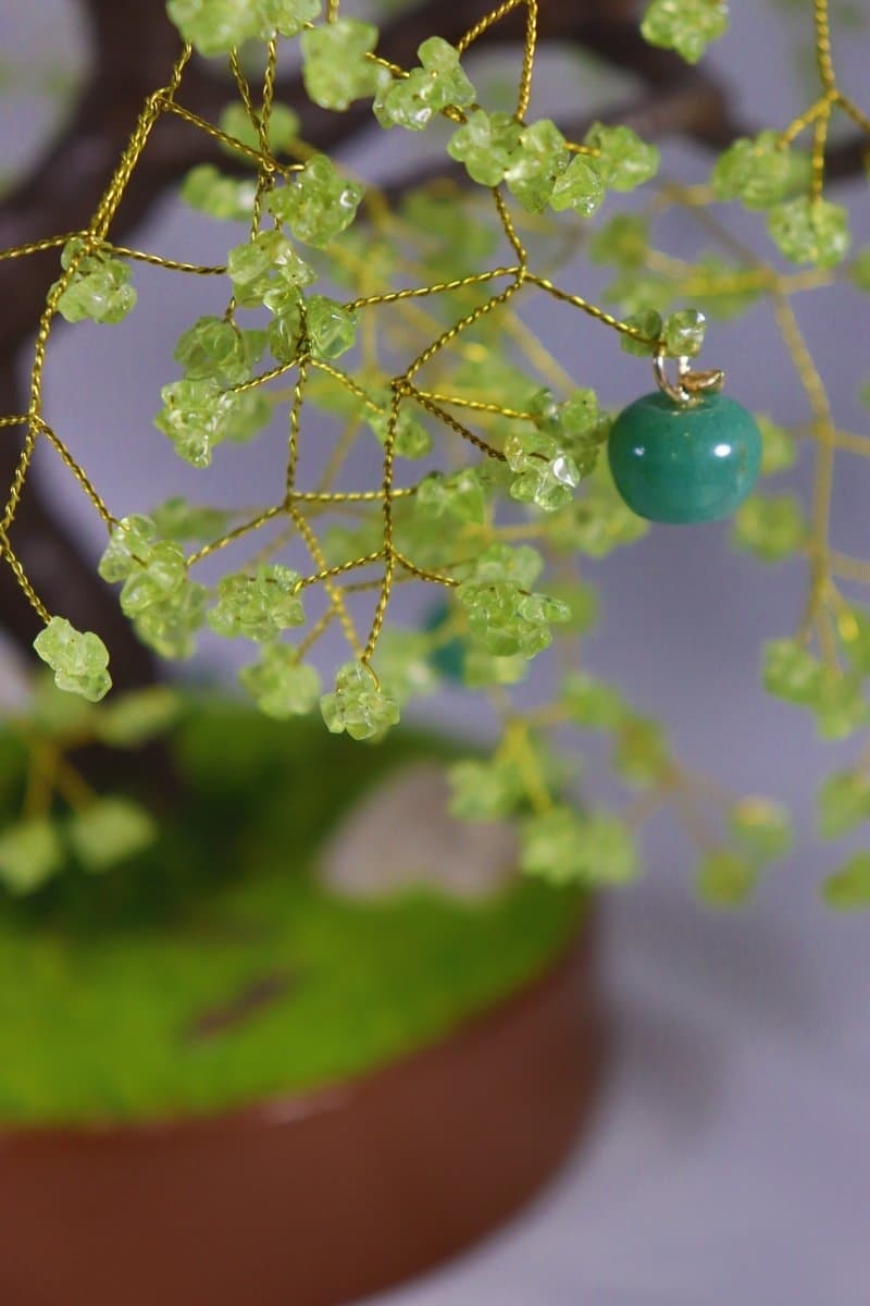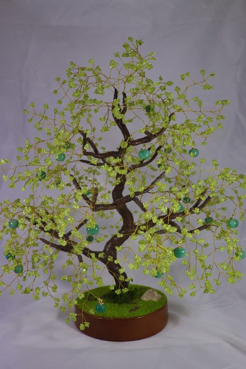 Крохотные листья-самоцветы крепятся к латунной проволоке и образуют крону деревца счастья. А готовые веточки крепятся к стволу, после завершения сборки мастер изгибает ствол и ветви деревца таким образом, чтоб добиться максимальной естественности линий. Дерево счастья готово — рассматривайте фотографии и сравнивайте его с соседями по каталогу.